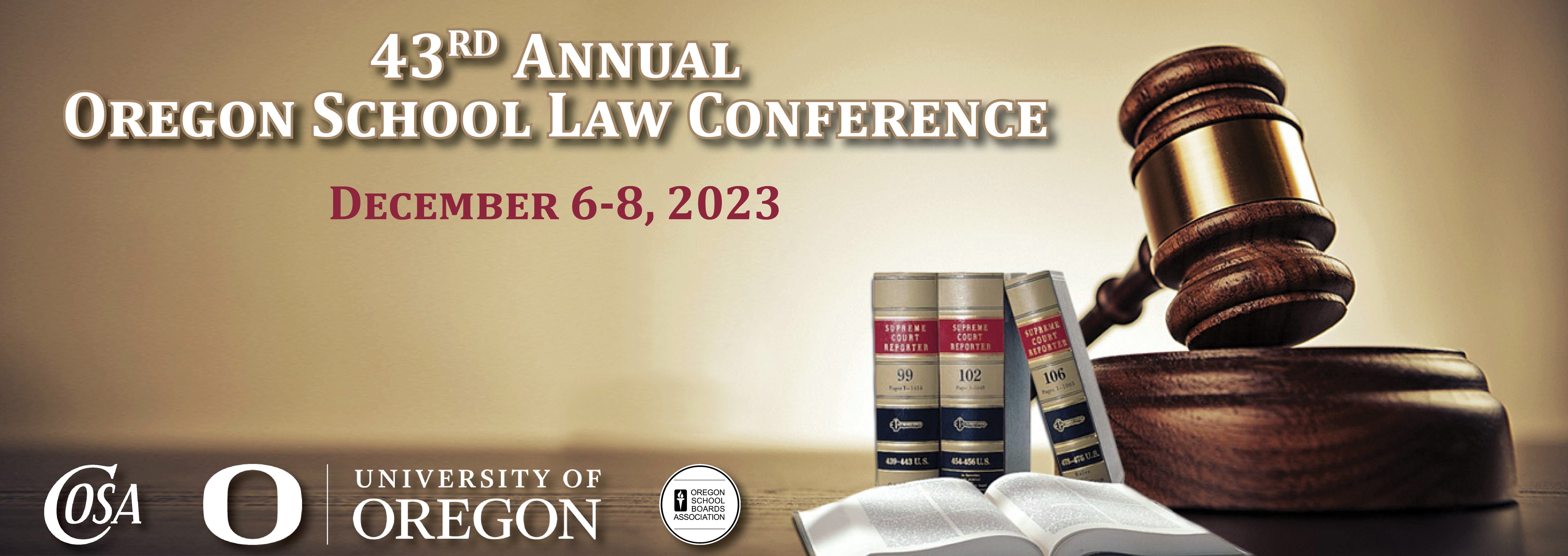 SPECIAL NOTE: The Oregon School Law and Finance Seminar 2023 is a separate 2-credit course that is held in conjunction with the COSA Oregon School Law Conference and meets the TSPC Oregon law and finance requirements for administrators coming to Oregon from another state. The seminar is designed to provide school administrators with up-to-date information on legal and financial issues critical to Oregon schools. Please note that there may be additional work after the completion of the conference. The fee is for the University of Oregon academic credit. The Law Conference on December 7-8 is a requirement to receive credit for the University of Oregon course. Participants will need to register for BOTH the University of Oregon seminar AND the Law Conference as a participant. Oregon School Law and Finance Seminar 2023 (Winter 2024 CRN 25929).